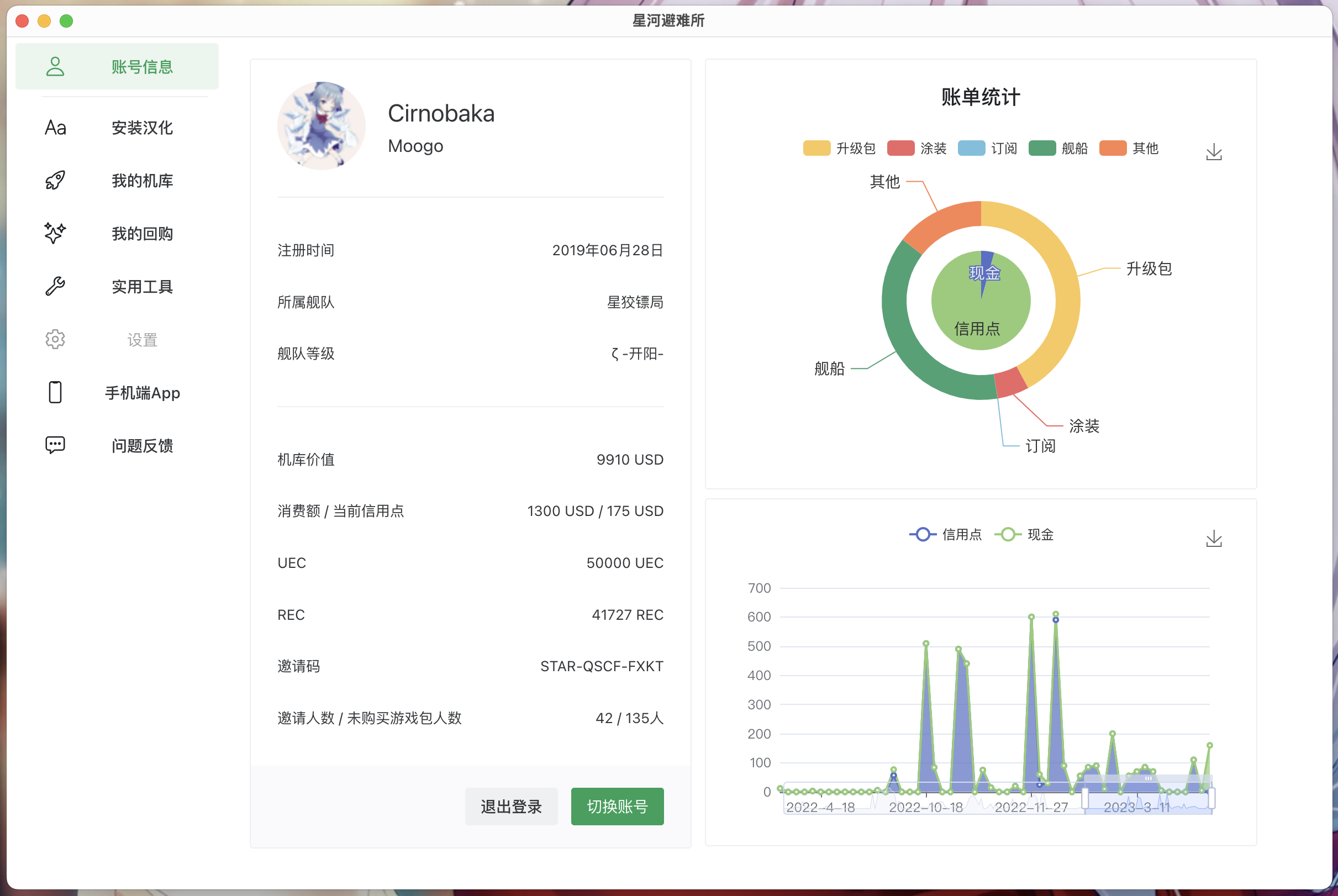 像安卓端一样,星河避难所PC端能自动获取消费额,当前信用点,消费额等信息。另外,PC端还添加了历史账单分析功能,如上图所示,避难所能将历史消费情况以饼图和折线图的方式直观的显示出来。